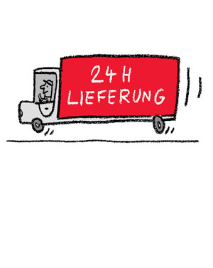 These illustrations show the advantages of a German mail-order house. Customers can order items online and get them delivered within 24 hours.